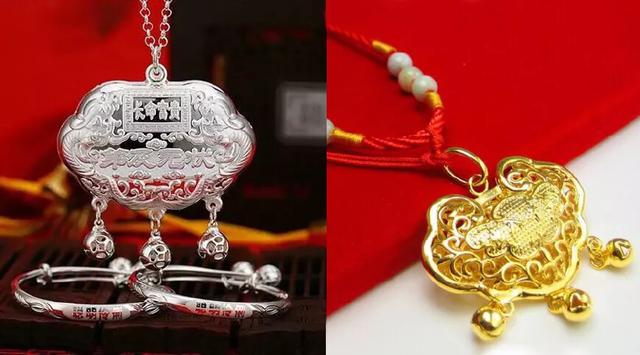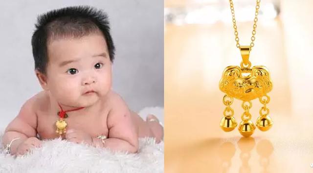 儿童佩戴黄金生肖吊坠和长命锁,寓意吉祥平安、趋吉避凶。胖乎乎的宝宝锁,又可爱又富态。