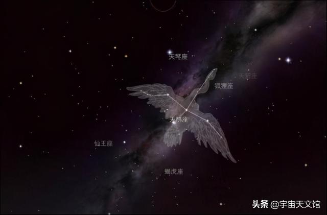 我们先来认识天鹅座,天鹅座是北天星座之一,因为它的主要星排列得像一个大十字架,所以过去也被称为“北十字”,十字下那长长的一竖是天鹅的脖子,一横就可以看作天鹅展开的双翼。