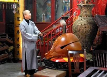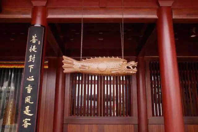 在圆形的“木鱼”中,不仅有首尾相接的单鱼形和双鱼形,后来更出现了一身二头的龙形木鱼。据说这是取乎“鱼化成龙”,以表“转凡成圣”的意义。