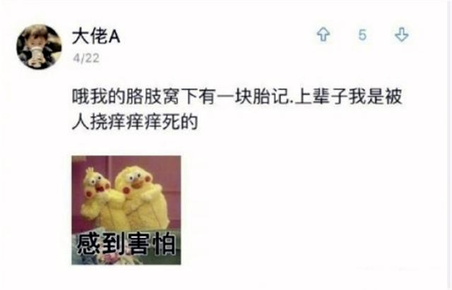 而前段时间的一个新颖话题引起了很多网友的关注,有人说:胎记就是前世的致命伤口。这个脑洞大开的说法已经流出,就让很多网友开启了“乱入模式”,纷纷根据自己身上的胎记,猜测自己“前世死因”,其中一些评论让大家纷纷笑场调侃:“哟!您这死法真稀罕”