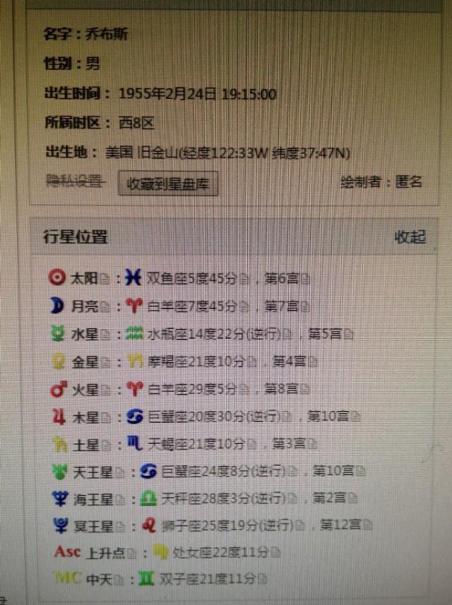 这是乔布斯的星盘。星盘中可以看出,上升星座落在了处女座的位置22度11分,处女座的人我们都知道工作挑剔,认真,做到极致,完美主义者,注重细节到极致苛刻。马云也是处女座的代表人物。上升处女座带来的影响,使工作上,发布会每一个细节把握的那么细致。你可以看下乔布斯的苹果发布会,简直是完美主的提现。
