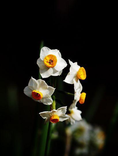 水仙花瓣多为6片,也有8片的,酷似椭圆形,花瓣末处呈鹅黄色。花蕊外面有一个如碗一般的保护罩。花葶自叶丛中抽出,高于叶面;一般开花的多为4-5片叶的叶丛,每球抽花1-7支,多者可达10支以上;伞房花序(伞形花序)着花4-6朵,多者达10余朵;花白色,芳香;花期1-2月。