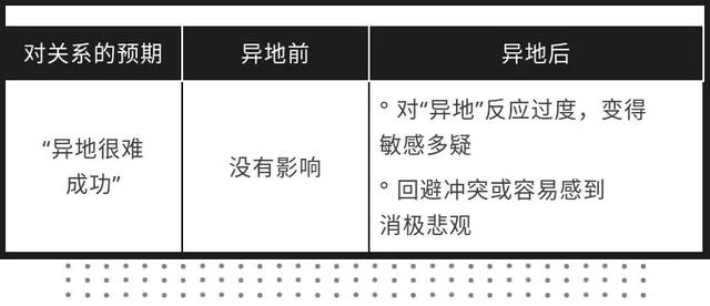 再比如,自身因为怀揣着“异地艰辛”这一信念,给恋情预言了一个消极的结局。因此在遇到问题的时候有意识或无意识地过度反应或者回避问题。