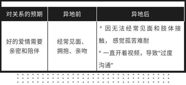 比如,习惯于近距离恋爱的我们常常把原有的预期带入到异地恋中,但是在异地关系中可能就显得不那么适用,给自己和关系带来了很多问题。