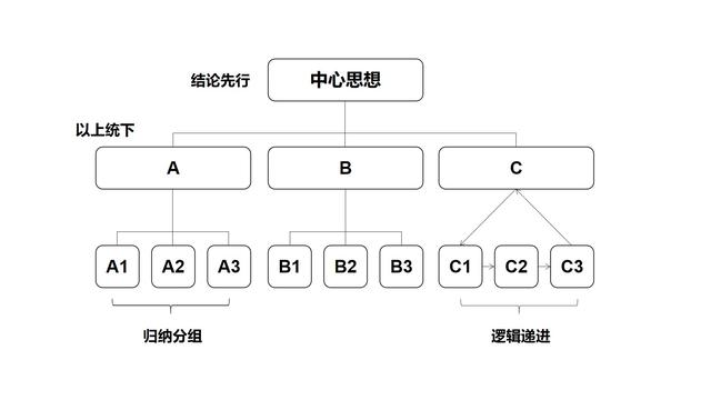《金字塔原理》一书中是这样解释的:“自上而下,任何事情都可以归纳出一个中心论点,而此中心论点可由三至七个论据支持,这些一级论据本身也可以是个论点,被二级的三至七个论据支持,如此延伸,状如金字塔。”