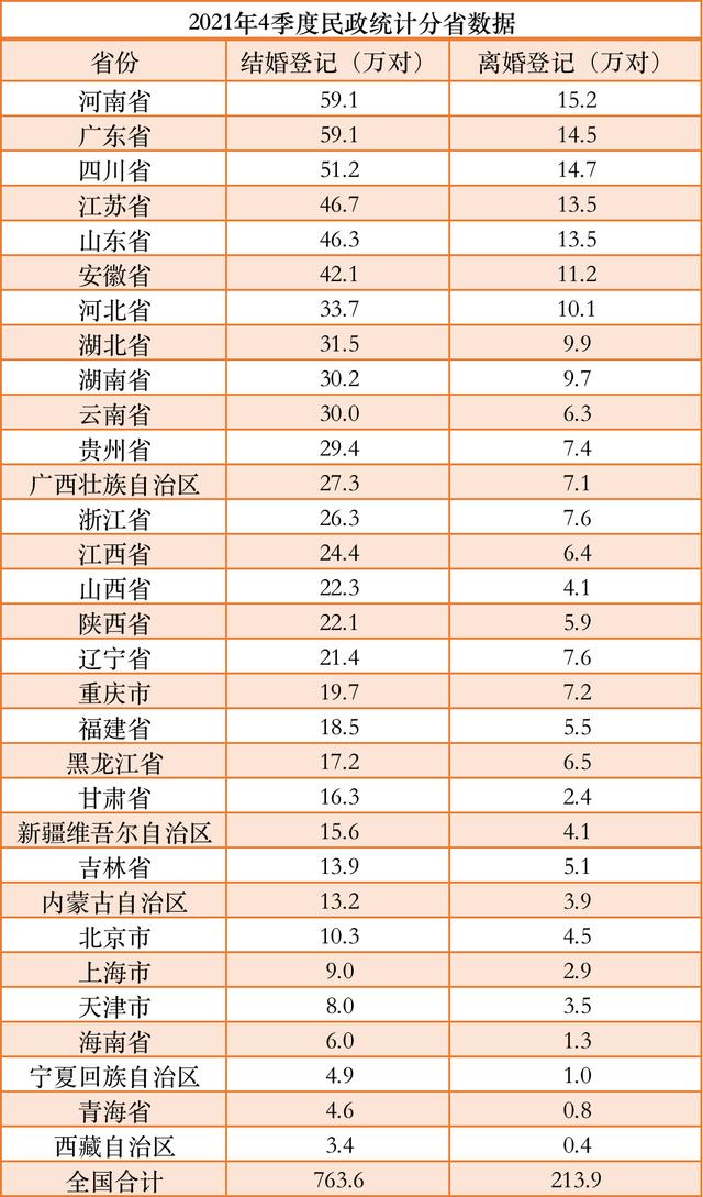 3月18日,民政部发布《2021年4季度民政统计数据》。数据显示:2021年全国结婚登记763.6万对,离婚登记213.9万对。