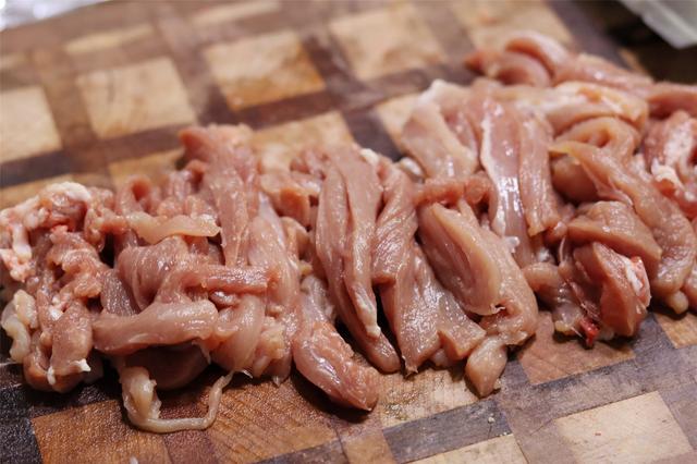 1、里脊肉切成粗条,老话说“横切牛羊竖切猪”,切猪肉要顺着肌肉的纹理切,做出来的菜比较有形。