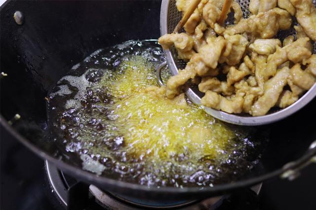 5、锅中烧油,6成热后里脊肉一根根下锅油炸至浮起变色,捞出控油,油温8成热复炸一遍使其变得焦脆,复炸时间不要太长,半分钟足够了。