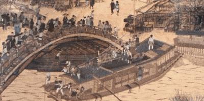 在画面中央,一艘逆流而行的船的桅杆将要撞上桥梁,船工们纷纷忙活,有人放桅杆,有人划桨应对冲来的激流。咋看并无不妥之处,但水上并不拥挤,为什么船工们到了临撞上时才作挽回?即使船工们纷纷玩忽职守,河边那么多来来往往、观看风景的人为什么不做一句提醒?