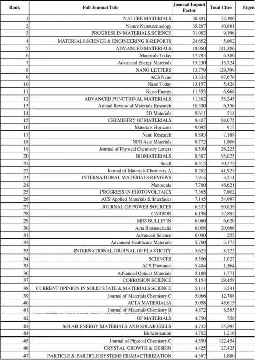 2016年材料类SCI影响因子