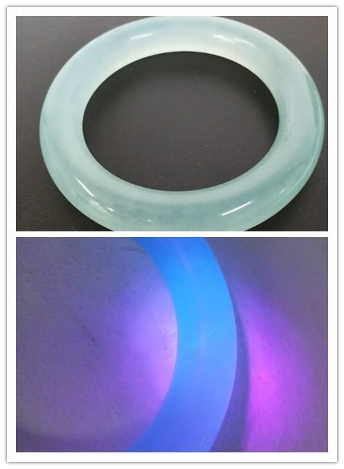 充胶染色石英岩光泽上看和冰种翡翠就不是一个档次,内部裂隙有模糊感,轻轻敲击会有沉闷的声响,紫光灯下放出明亮的荧光。