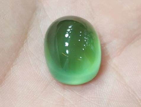 葡萄石是一种硅酸盐矿物,又称“绿碧榴”,优质的葡萄石外观和冰种看起来极为相似,鉴别特征是内部具有和冰种翡翠完全不一样的定向排列的放射状结构,光泽略弱于翡翠,绿色中带有黄色调。需要注意的是葡萄石也能出现“起荧”现象,不能做为鉴定特征。