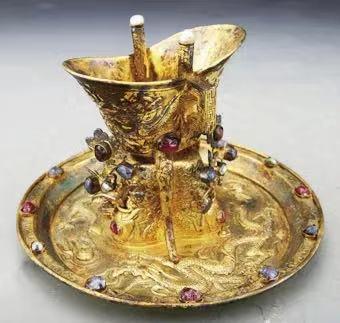金爵杯,满身饰以金龙,并将其放在二龙戏珠的托盘内,周围镶有珍珠宝石制成的花钗,更加显得富丽堂皇。它是定陵出土的金器中含金量最高的一件,整件金爵杯构思巧妙,造型优美,装饰华丽,富有强烈的稳定感,具有很高的艺术价值。