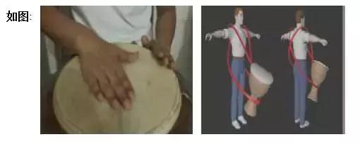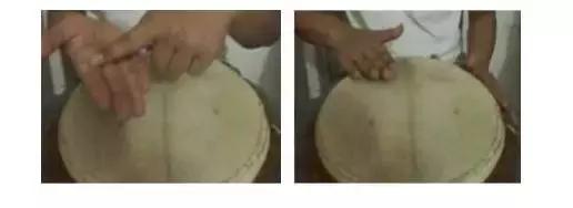 打高音时手指放松的张开,但不要张的很大。在打击时用手指根部的肉垫打击鼓边,在冲击的同时指尖击打在鼓面上。指尖和根部肉垫之间的部位是不接触鼓面的。接触鼓面的只是指尖部位。如图: