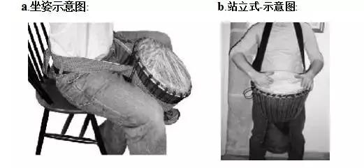 站立式:站立式需要使用背带,背带有腰间挂,颈部挂和双肩背带三种,因人而异,要选择自己适用的背带。演奏时注意挺胸,背部脊椎拉直,鼓桶贴靠双腿内侧。c.低音 B 手法: