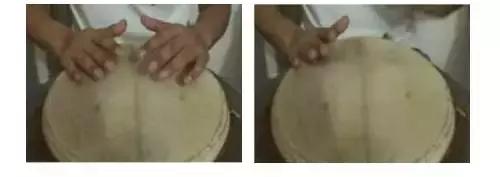 四指并拢,手臂放松;打开,手臂和手腕成直线。打击的位置靠近鼓的中心,也会根据鼓面的大小位置有所移动,鼓越小打击的位置越是靠近中心。无论鼓的大小,手肚在打低音时都必须在鼓面上。用整个手掌打击,打击时快速的弹起,落下的重心在掌心。