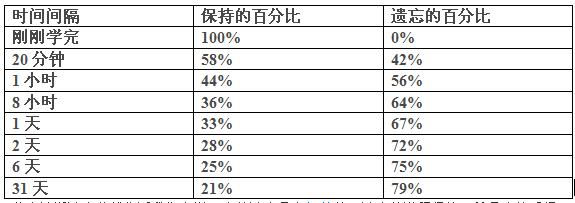 从上表中我们可以发现:遗忘速度最快的区段是20分钟、1小时、24小时,分别遗忘42%、56%、64%;2—31天遗忘率稳定在72%—79%之间;学习知识后如果不及时复习,一天后记忆的保持量就只剩下33%,