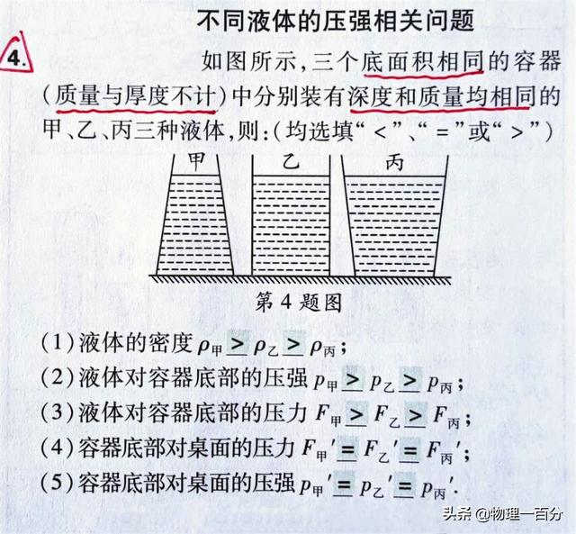 比如下面这道题,三个底面积相同的容器,液体深度和质量均相同,于是,经典的五个问题出现了。