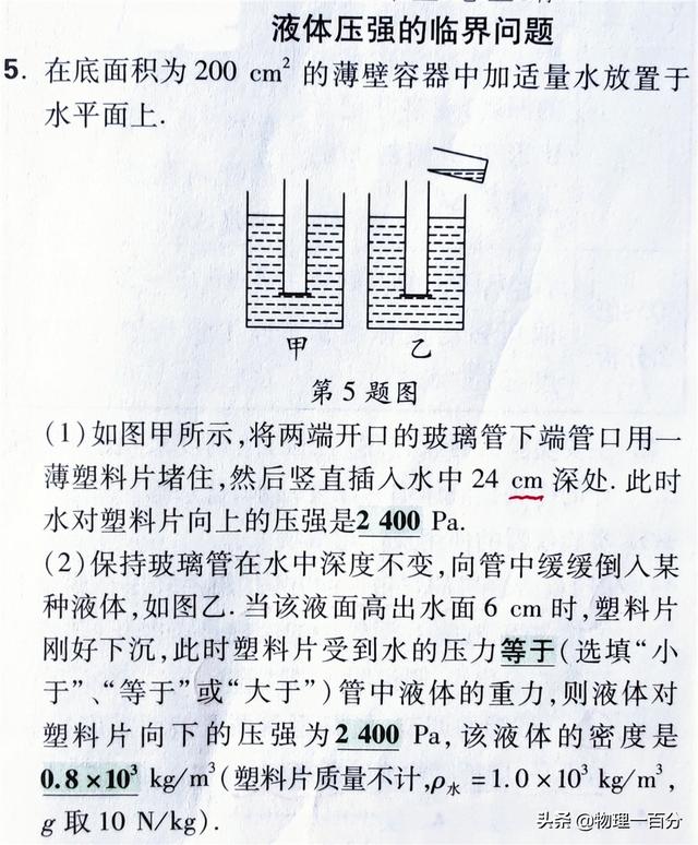 第二问,给我们的启发是,既然倒入管中的液体高度比容器中的水面高,说明此液体密度低于水!既然此时塑料片“刚好下沉”就是说塑料片受到水的压力等于管中液体的重力,而管中液体产生的压强也等于外部水产生的压强。
