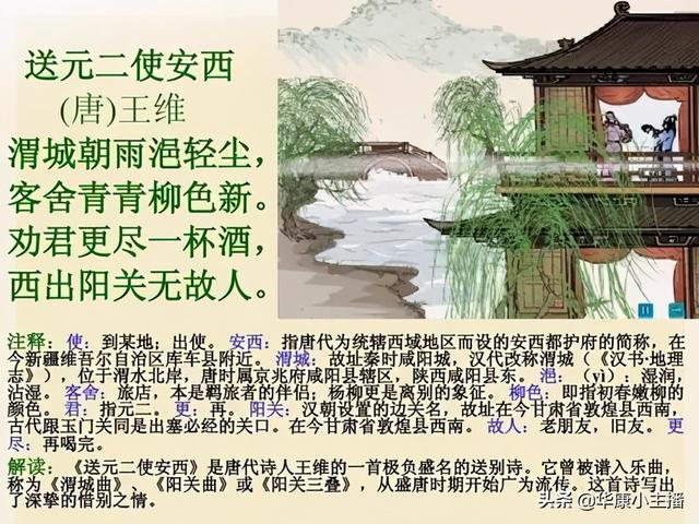 1.渭城曲:另题作《送元二使安西》,或名《阳关曲》或《阳关三叠》。