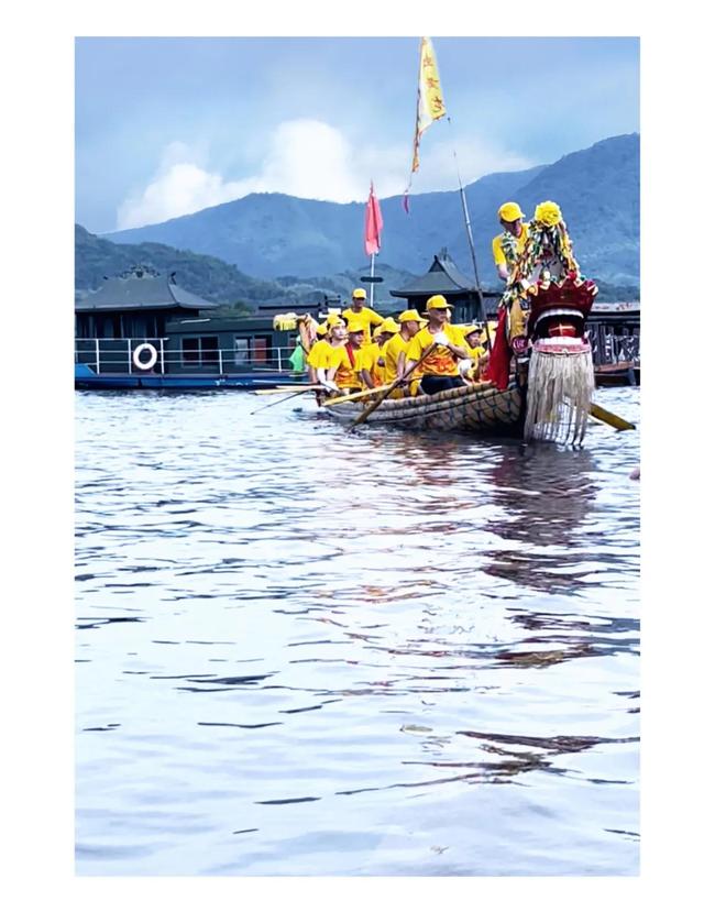 清晨,细雨蒙蒙的桃花潭,水面薄雾弥漫,红色、蓝色、黄色与白色龙舟队来来往往,时隐时现,充满诗情画意;临近中午,晴空蓝兮,水与天相接,蔚为壮观。