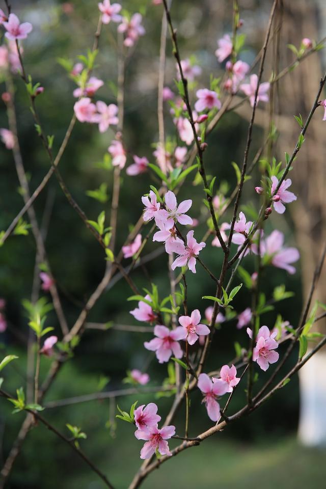 第四,花叶同放。桃花最好看的就是花枝,几朵花簇生在一枝上,衬着新长出的嫩绿叶子,很活泼的愉悦。