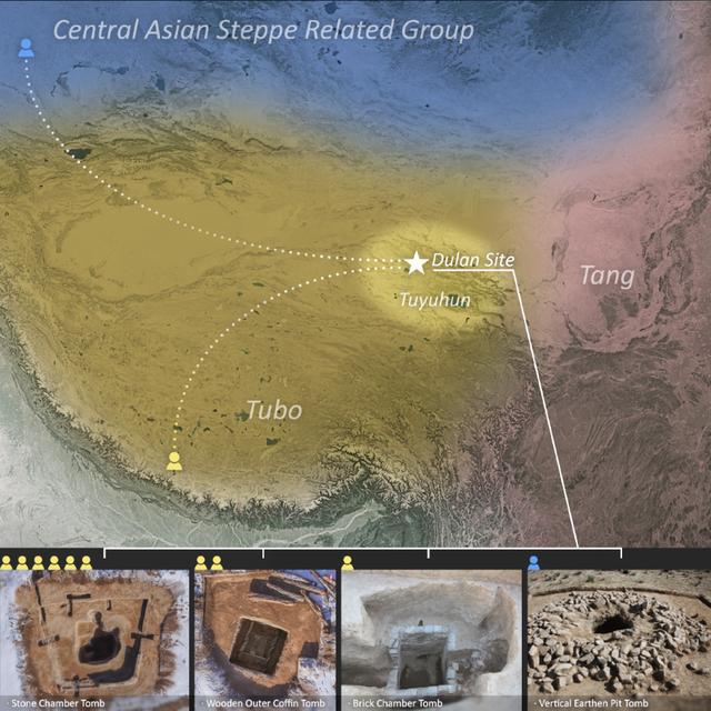 此项研究发现,样本中的9个古代个体拥有与现代核心藏族人群、先前报道的尼泊尔古代个体相似的遗传成分,是目前为止发现带有相似遗传成分的古代基因组中,最东北缘的个体。这些个体反映了核心藏族人群向青藏高原东北缘的扩张迁徙活动。此外,研究人员还发现1例古代个体出自竖穴土坑墓,该墓葬类型在同时期的中亚和阿尔泰山区域较为常见。研究人员对该个体进行的遗传学分析也发现其与其余9例古代个体的遗传成分相距甚远,但与同期的欧亚大陆草原游牧人群拥有相似的遗传成分,表明了都兰区域与中亚可能存在人群交流互动。