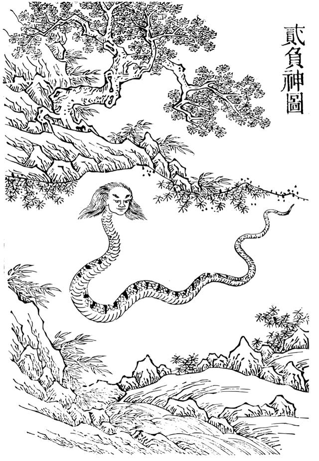 “贰负”神是一个人面蛇身的天神,他和他的臣子“危”杀死了另一个“蛇身、龙首、人面”的神“窫窳[yà yǔ]”。黄帝大怒,将“危”绑到“䟽属”山上,右脚上枷,反缚双手。《山海经》中“海内西经”与“海内北经”的记载大致相同。