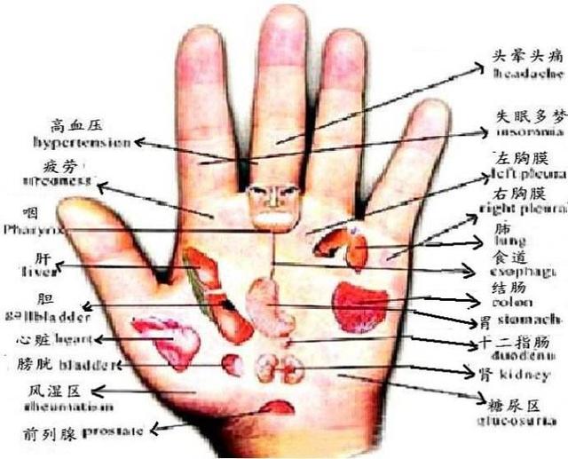 ●手背上,握拳时凹陷的中指指掌关节相当于人体的第七颈椎,假设靠小指侧有关节增生,则提示颈椎右侧有成绩。
