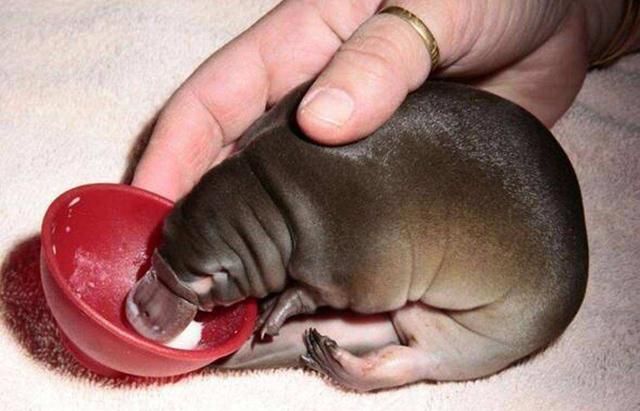 不过鸭嘴兽没有乳头,它们的鸭子嘴也不支持“吮吸”这个动作。所以它们的哺乳方式也与其他哺乳动物完全不一样。它的乳汁像是出汗一样,从腹部的皮肤上的毛孔里渗透出来,通过皮毛汇聚到了鸭嘴兽肚子上的一个凹陷处,小鸭嘴兽就趴在妈妈的肚子上舔舐乳汁。