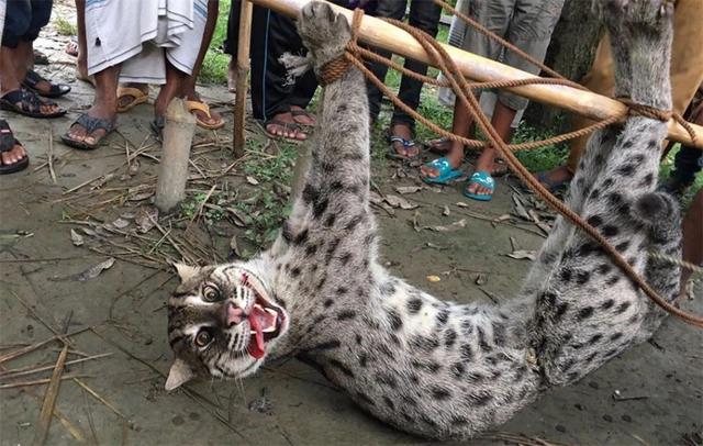 在印度西孟加拉邦,村里的摄像头拍到,一只凶猛的野兽进村袭击了狗,把狗活活咬死了。结果村民把它当成了老虎,为了防止“老虎”再次进村伤害人畜,等钓鱼猫再次出现时,多人用棍棒将其打死。