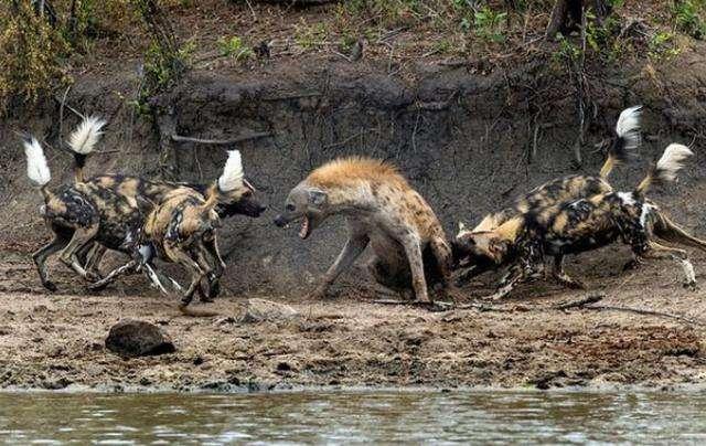 在非洲大草原上,与斑鬣狗冲突最多的就是非洲野犬,因为它们属于同一生境的食肉动物,本身就水火不容,再加上它们的猎物有着高度的重合(都以有蹄类动物为食),所以,无论是斑鬣狗还是非洲野犬对对方都是仇视的。但是,由于非洲野犬族群数量较多,加上它们有思想和团队精神,所以,大多数时间,都是几只野犬欺负落单的斑鬣狗,甚至将其反杀。