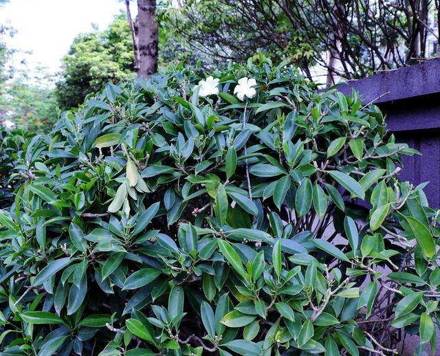 小区花园里被修剪成圆形的观赏树灰莉开了几朵花,芬芳四溢,赏心悦目。