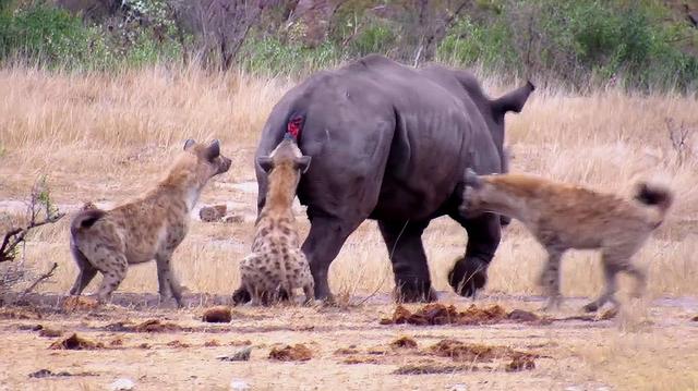 照着腹部等柔软的地方下手,也会使动物肠流满地,进而引发代谢等问题而失去抵抗能力。鬣狗的另一个绝技更加凶残,那就是生啃。食物来之不易,鬣狗这种体型并不是很大,捕猎技巧不是很出众的猎食动物,知道一口一口地获取食物,吃一口够本,啃两口赚了。鬣狗围绕一时半会难以打倒的猎物的时候,它们就会生啃,啃下来啥就吃啥,自己反正不亏。然而在这种生啃的攻势之下,大多数动物会因为疼痛带来的应激反应或者骨骼肌肉的损伤而逐渐丧失抵抗能力。