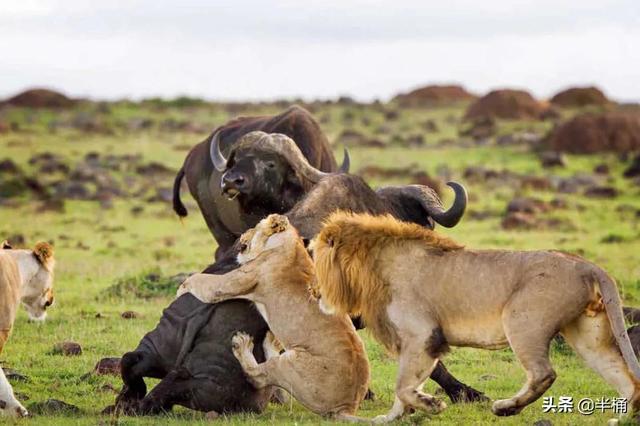 野牛是狮子们最喜欢的猎物之一,因为野牛能够提供更多的肉类,但是狮子想要捕获一头野牛也并不容易,它们往往只能猎杀落单的老弱病残。而且需要很少参与狩猎的雄狮出场,才能有机会捕获一头野牛,不在捕猎过程中,狮子有时候还会受伤。