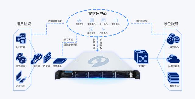 在所有的零信任架构中,最中心的部分都是“安全网关”。安全网关是零信任理念的执行者,通常部署在政企应用服务的前端。通过安全网关串联,能够隐藏政企服务内部资源,提供政企应用服务的对外统一入口及状态实时监测,避免内外网政企用户的不安全访问,保障数据安全。