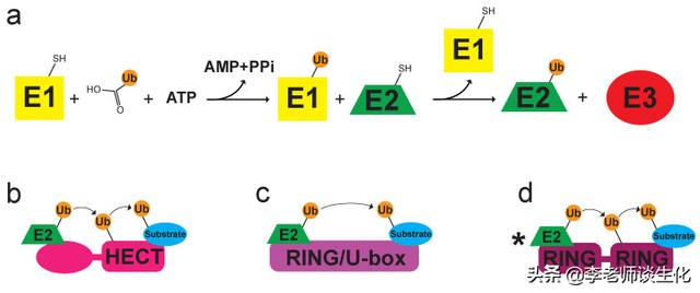 泛素与底物的结合是通过由E1、E2和E3催化的多步反应进行的。E1利用ATP水解产生的能量,使自身催化位点半胱氨酸的巯基与泛素的羧基之间产生硫酯键。然后,活化的泛素被转移至E2的巯基上。最后,由E3将泛素转移到特定的底物上。