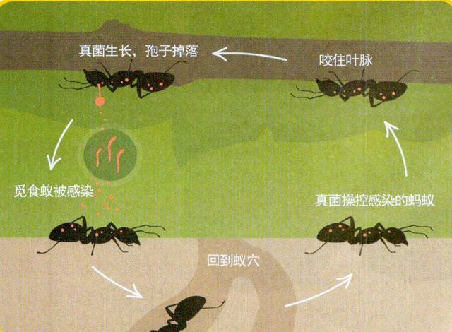僵尸真菌寄存在蚂蚁的大脑中,然后指挥蚂蚁为自己寻找一个安全又舒适的地方,当找到树叶以后,僵尸真菌会选择杀死蚂蚁。