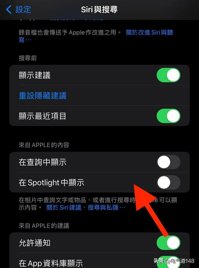 如果用户不太需要 Spotlight 显示太多内容,其实可进入设定内的“Siri 与搜寻”,将来自 APPLE 的内容中“在 Spotlight 中显示”关掉,这样会省下一些重整资料库的时间,同时也不会令系统变慢。