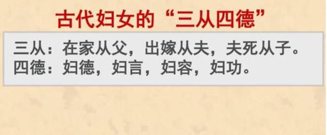 在封建时代下,三从四德就是妇女的行为规范。“三从”在《礼记.丧服.子夏传》中也有记载:“未嫁从父、既嫁从夫、夫死从子”。四德指的是“妇容、妇德、妇功、妇言”。翻译过来就是“端庄的相貌、好的品德、治家之道、言谈举止”。