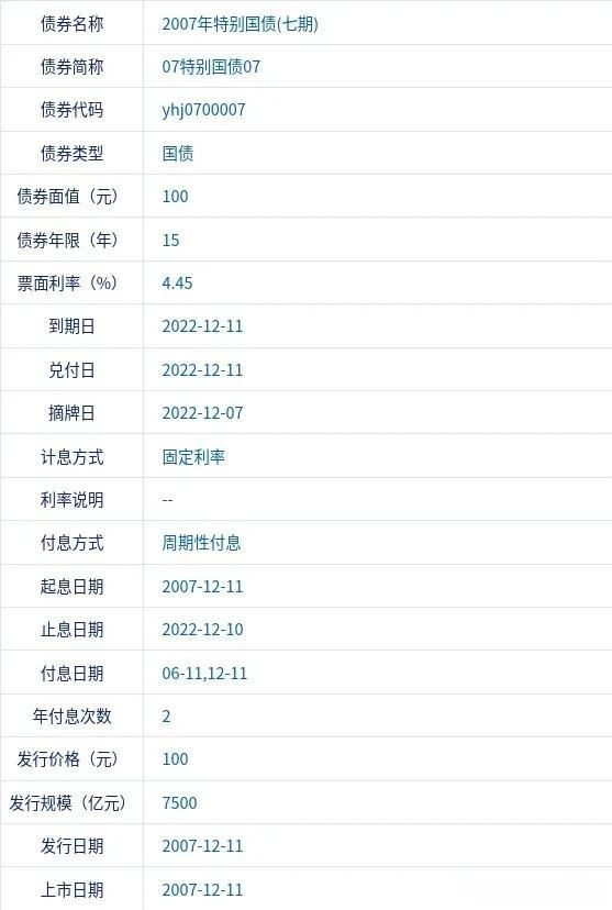 看到这里我们就明白了,“07特别国债01”在2017年8月到期,当年进行了续作,“07特别国债07”将在2022年12月11日到期,本次发行的7500亿元特别国债是对这支特别国债的续作,所以它的发行日和起息日是2022年12月12日,正好无缝衔接。