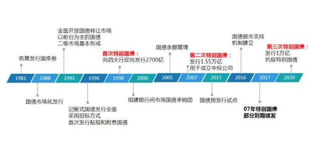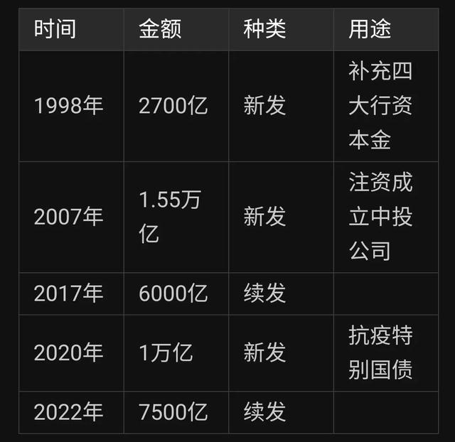 既然称为“特别国债”,它的发行就不是常态化进行的,迄今为止,我国一共只发行了五次特别国债,分别是1998年、2007年、2017年、2020年和2022年,包括3次新发(98年、07年、20年)和2次续作(17年、22年)。