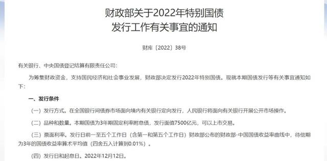 12月9日,财政部决定发行2022年特别国债,品种为3年期固定利率附息债,发行面值7500亿元,一石激起千层浪,引发市场热议,在政治局会议定调明年经济,防疫新十条公布的特殊时期,发行7500亿元特别国债,释放了什么信号?