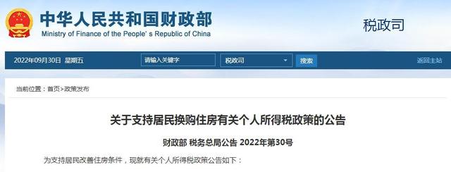 据财政部官网9月30日消息,财政部发布支持居民换购住房有关个人所得税政策的公告。