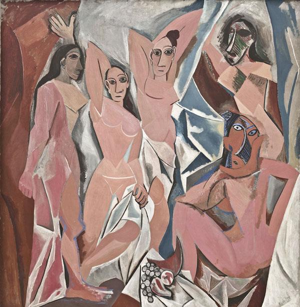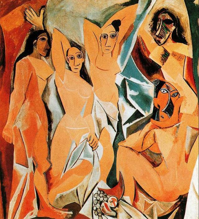 毕加索的《亚威农少女》通过几何式的穿插与分割,将所有的物体和背景统一在一个二维平面中,这幅画的诞生被学者们认为是立体主义的开端。