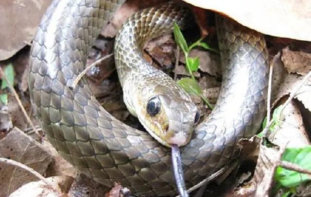 灰鼠蛇,又名索蛇、上竹龙、过树龙、黄梢蛇等。在我国主要分布于华南地区,包括香港、台湾。灰鼠蛇体略长,一般可以长到1米以上。体背呈现棕褐色或橄榄灰色,体中、后部每一背鳞中央都有黑褐色的纵线,腹部呈现淡黄色。灰鼠蛇行动敏捷、性格温顺、胆子小,一般不会主动攻击人。灰鼠蛇也有冬眠的习性,在11月份过后,灰鼠蛇一般会找一个老鼠洞来越冬,在次年的天气温暖的时候苏醒活动。