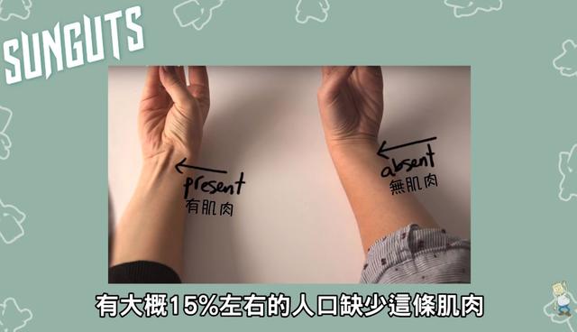 三个字在YouTube影片中指出,小指与拇指碰在一起,并将手腕微微弯下,若手腕有条明显凸出的肌肉代表着你是未进化的人类,其称为「掌长肌(Palmaris longus)」有15%的人缺少这条肌肉,这些人是已进化人类。掌长肌最常见于擅长爬树的灵长类,而人类早已不需要靠爬树讨生活,因此这条肌肉变得可有可无,「所以才会有个说法是没有掌长肌的人,才是进化后的人类。」