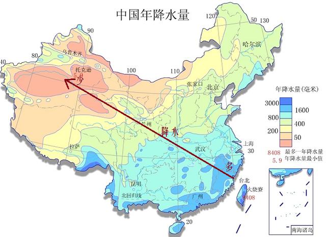 中国降水量分布图