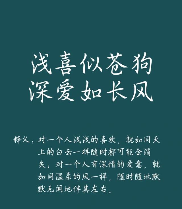 浅喜似苍狗,深爱如长风意思是:对一个人浅浅的喜欢,就如同天上的白云,随时都可能会消失不见。对一个人深深的喜欢,就如同温柔的风一样,随时随地默默无闻地伴其左右,永不会离去。出自宋代词人王忠维的《苍狗长风》。