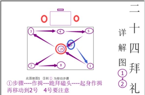 二十四拜的跪拜礼,与一跪三叩首、三跪九叩首相比,作揖和磕头的动作都一样,没有区别。二十四拜是跪八次磕二十四个头,共有八个地点要作揖磕头,每一次跪拜礼都是作揖一个、跪一次、磕头三个,基本步行图是八字形,吊唁者的具体行礼步骤和动作是: